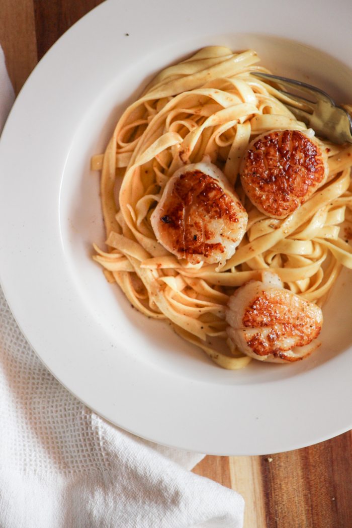 - To serve, pile some tagliatelle onto each plate and top with 3 scallops per person. Spoon over any remaining sauce.