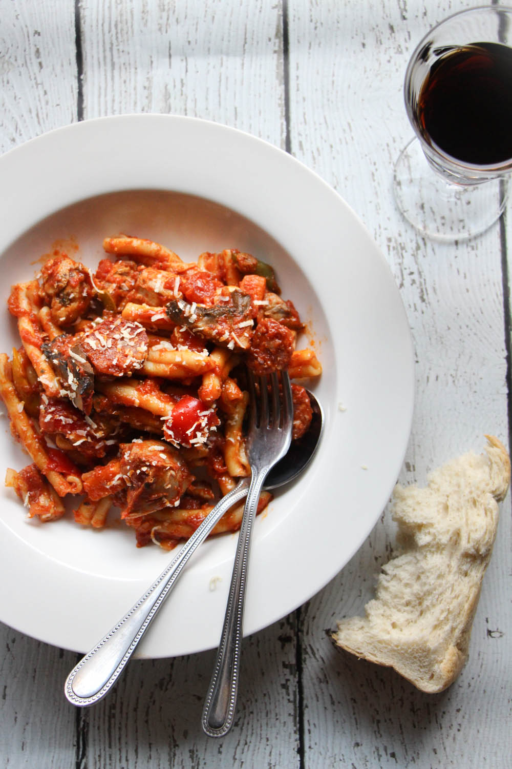 - When the sauce is almost done, cook the casarecce in a large pot of boiling salted water. Drain and add straight into the pot of sauce. Stir to combine the pasta and sauce then remove from the heat and serve with grated parmesan and crusty bread.