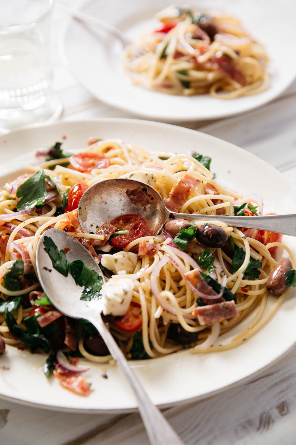 - Return the spaghetti to the empty pot and tip in the tomato mixture and the remaining olive oil and toss to combine. Add a few splashes of cooking water if necessary to loosen the sauce.