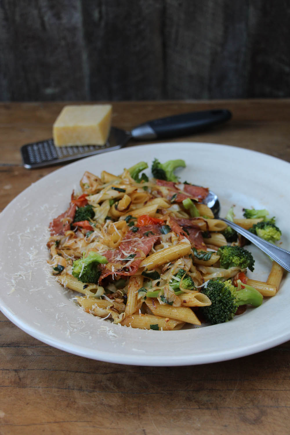 Penne with Cabbage, Broccoli, Blistered Tomatoes and Salami