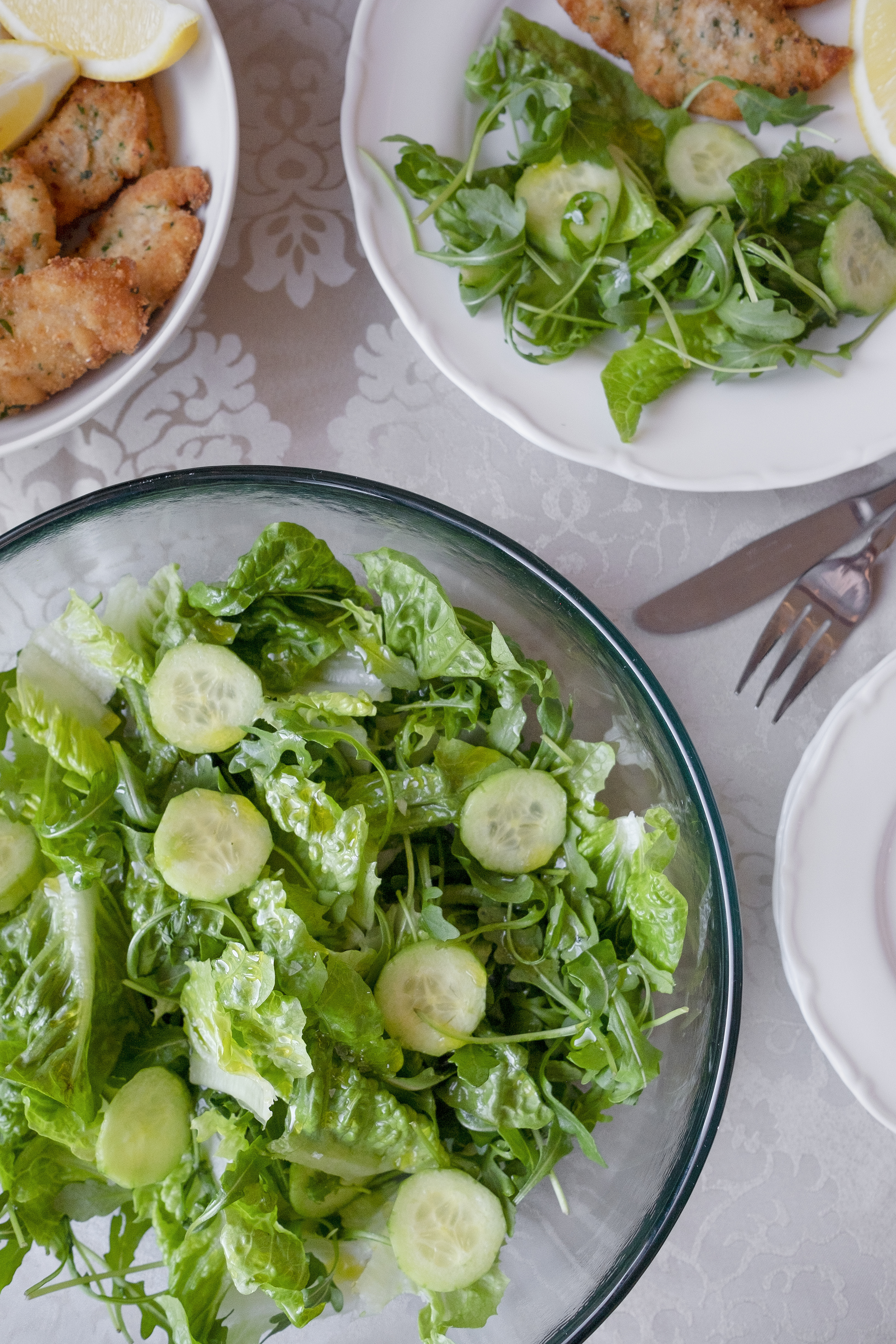 You know when you follow a recipe for something new and at the end, it suggests serving with a ‘simple green salad’? This is that salad. I’m almost embarrassed to write about it, it’s just so simple, something I throw together without even thinking about. It isn’t something I weigh, use spoon or cup measures. There isn’t anything remarkable about it. Just leafy greens and cucumber tossed with a simple vinaigrette. But it amazes me how often when guests are over for dinner they ask what goes into it. I usually shrug my shoulders, say something like ‘oh, nothing really, just olive oil, vinegar and salt’, because that is how simple it is. But then I am asked ‘how much,’ ‘what vinegar,’ ‘what kind of oil’, as if there is some magic to it. But honestly, I use whatever I’ve got lying around, like I said, I don’t think about it, just toss by eye.