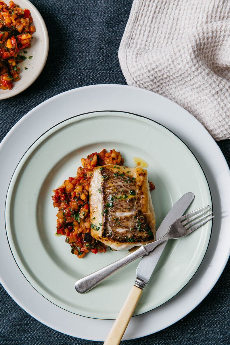 - Sprinkle the caponata with chopped parsley and toasted pine nuts. Place a spoonful of caponata on the plate and top with a piece of cooked fish. Drizzle with a little olive oil and serve with lemon wedges and chopped parsley