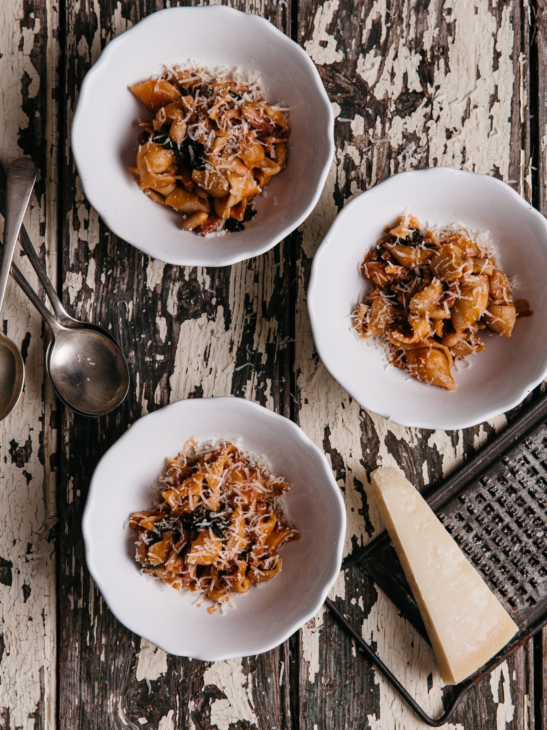 This is a staple recipe in many Italian households and therefore there are a myriad of versions. Served most often as a rib-sticking soup, it is fast to make if you use canned beans. I like my pasta e fagioli with less liquid – more like a pasta dish than a soup. Typically a vegetarian meal, I like the addition of smoky pancetta to elevate the flavours.