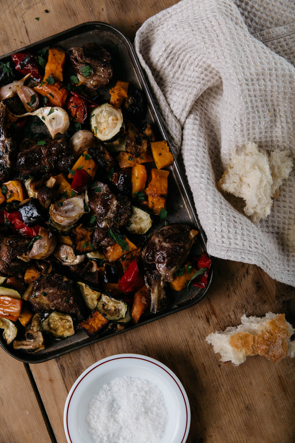 This is one of those dishes you can ad lib and change depending on what you’ve got – that’s how this dish would have originated. It’s generous, wholesome one pan cooking at it’s very best that you can modify to suit as many people as you need to feed. The whole garlic cloves will be sweet and tender after cooking in their skins, ready to be smeared over the meat while you eat.