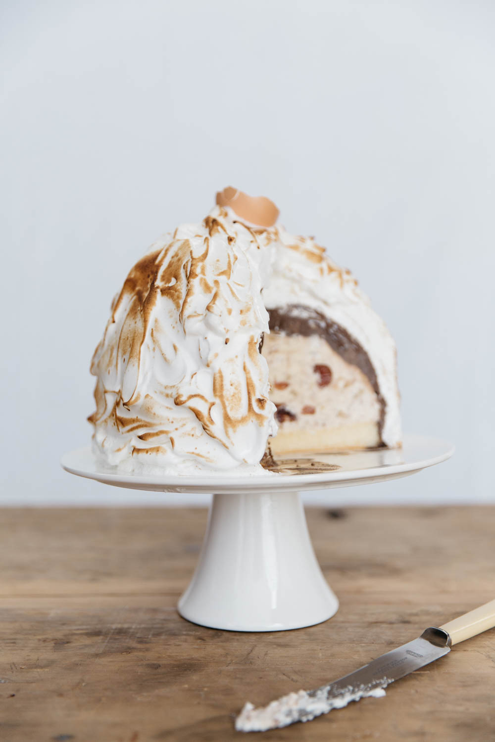 If you want to add the theatrics of fire, rinse out half an eggshell and embed in the top of the meringue just before serving. Warm a half cup of brandy in a small saucepan and pour into the eggshell, then set alight. Do this at the very last minute, preferably with lights dimmed for full effect, as the flame will not last long but looks very impressive.
