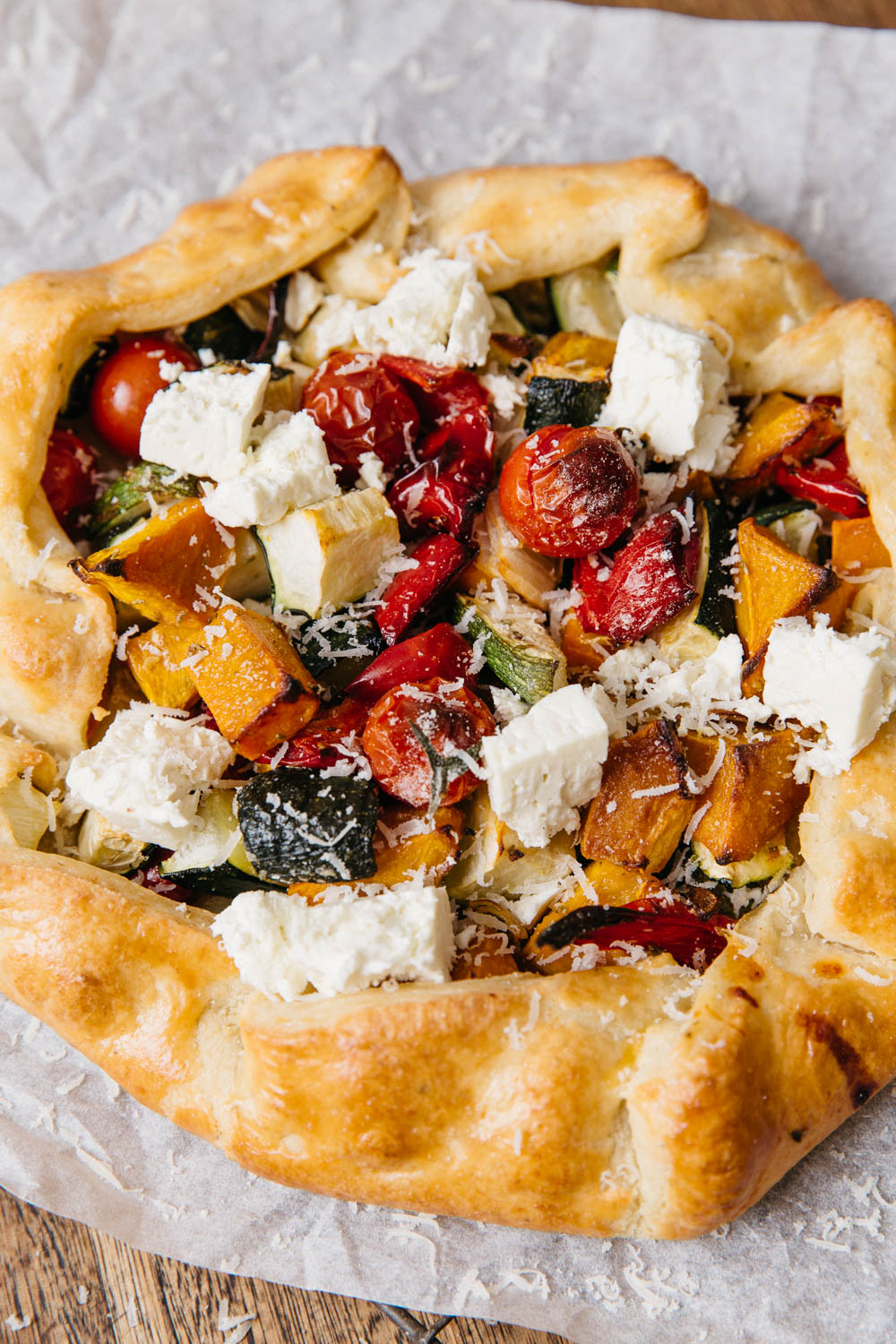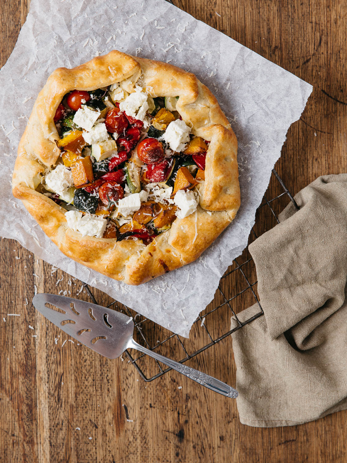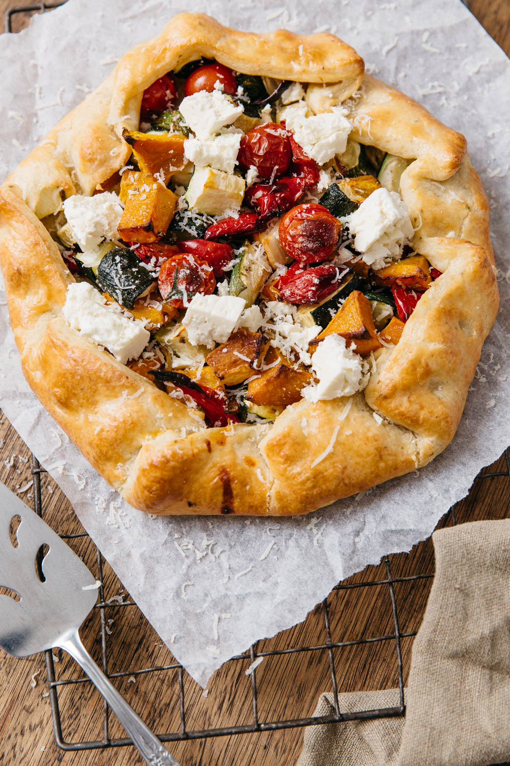 A crostata is a rustic free-form pie that is normally associated with dessert, filled with jam or fresh fruit, but it works really well as a savoury dish using roasted vegetables.