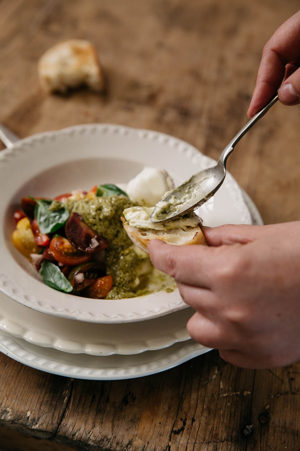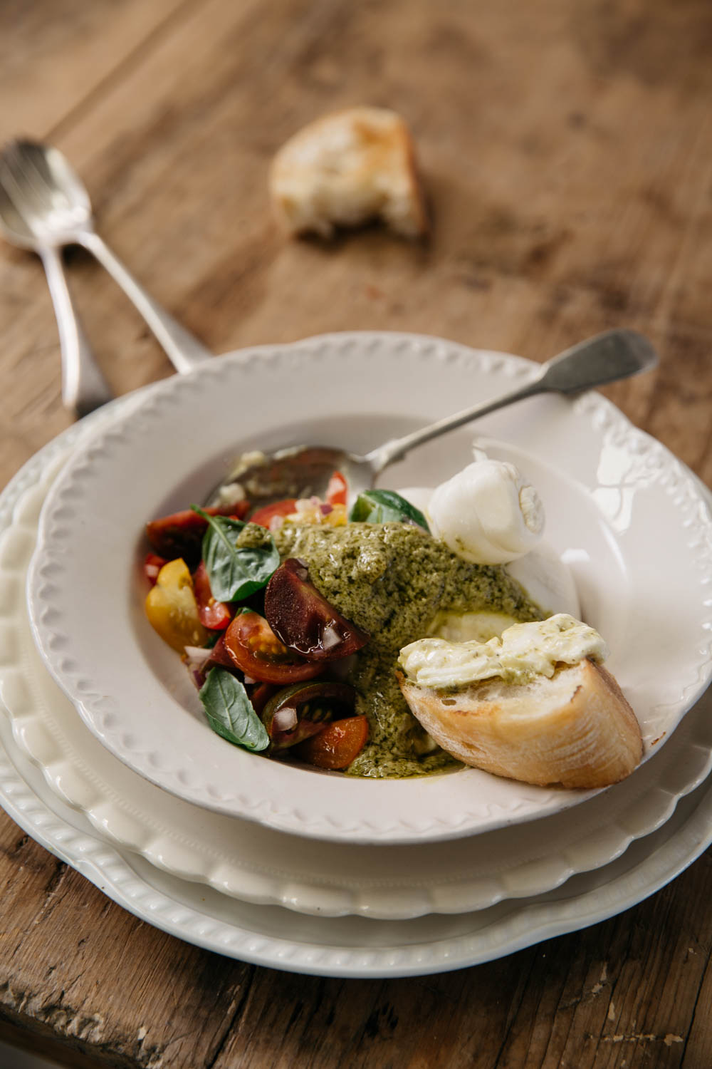 As with all things simple, the success of this dish relies on the quality of the ingredients. Firm, ripe tomatoes are paramount. You can use store-bought pesto here, but if you can get your hands on some fresh basil, I recommend making your own. It’s very simple – here’s my go-to recipe.
