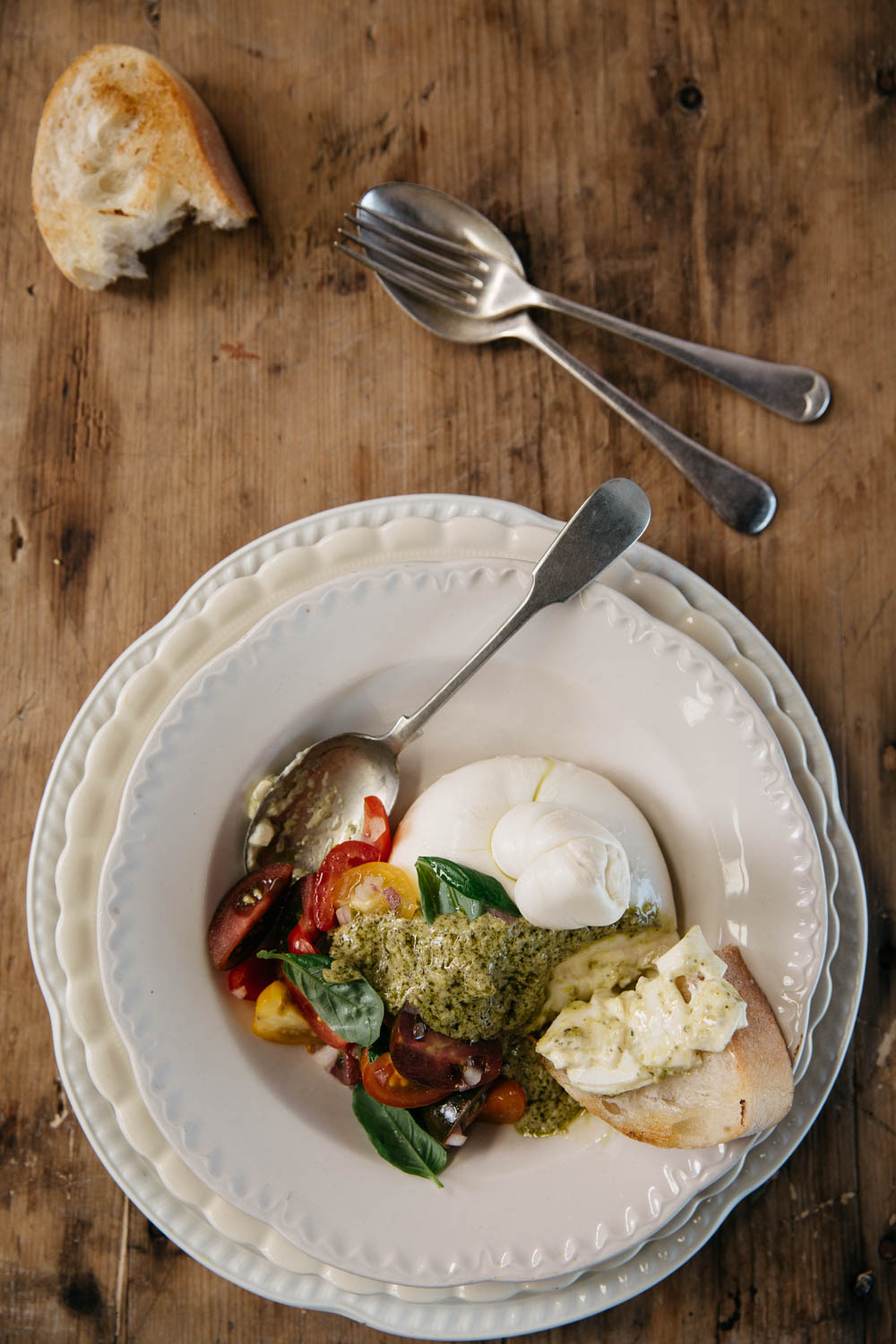 I really don’t think there is a better antipasti plate to share than good crusty bread, cheese and ripe tomatoes. This is a really nice way to serve a cheese appetiser before a meal, or on its own for a light, shared dinner. Everyone can scoop up some creamy goodness from the burrata cheese, topped with tomato salsa and pesto. Utterly delicious!