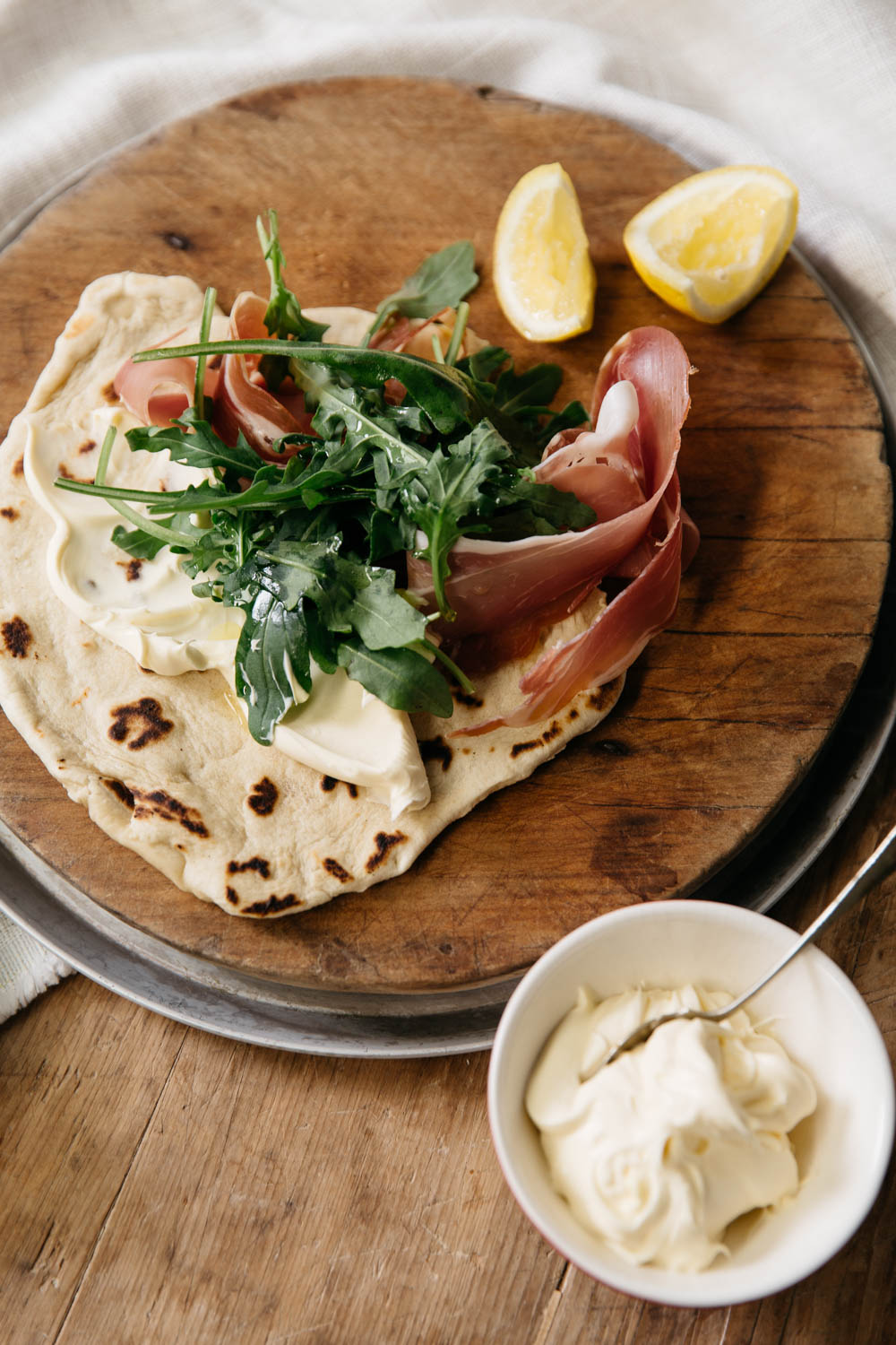 - Top cooked piadine with a smear of cheese, rocket tossed with lemon juice and olive oil, a little salt and pepper and slices of prosciutto. Alternatively go with filling of your choice.