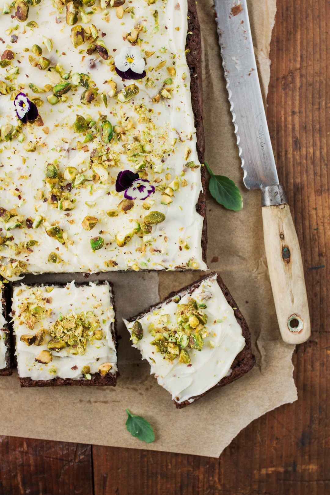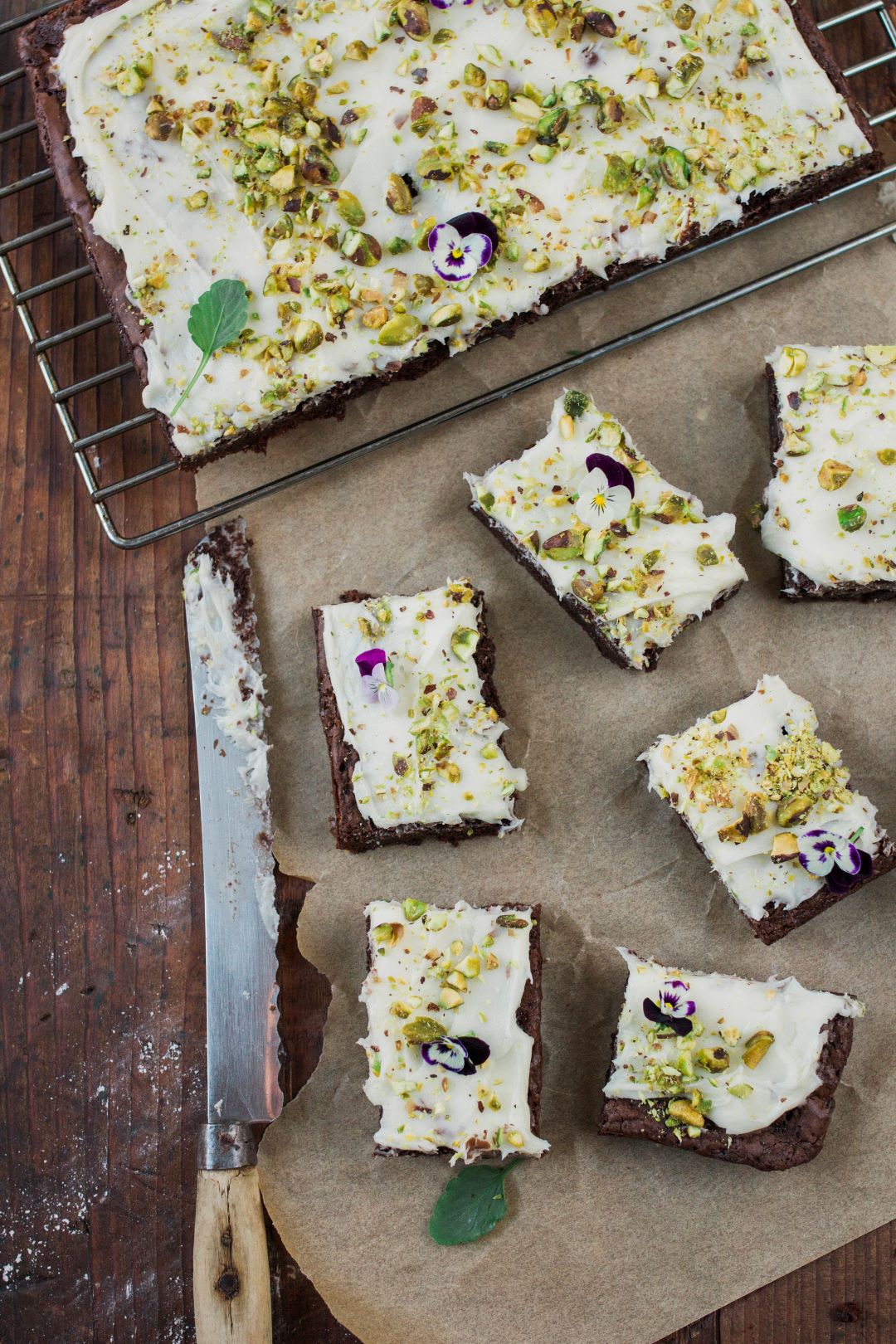 - Once brownies are cool, run a knife down the two short edges to loosen. Hold the two overhanging edges of baking paper and lift out. Spread the top with the ricotta frosting and sprinkle with extra pistachios.