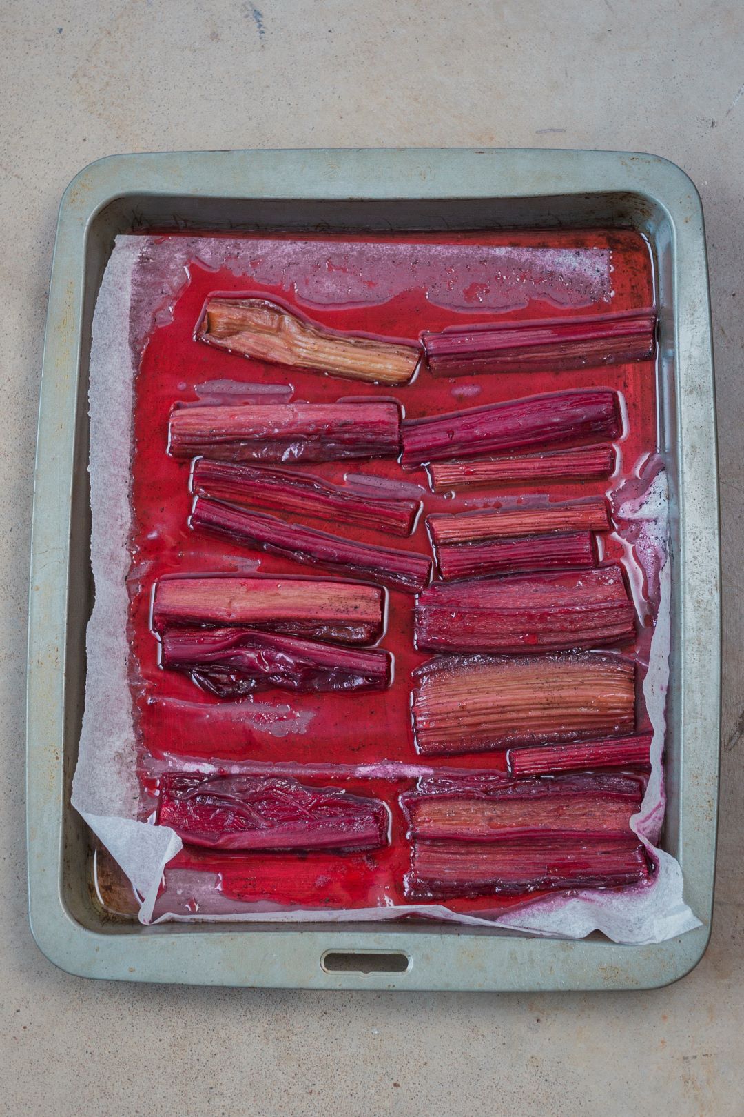 - Cut the rhubarb into 10cm (4 in) lengths and lay in a single layer in a baking dish.