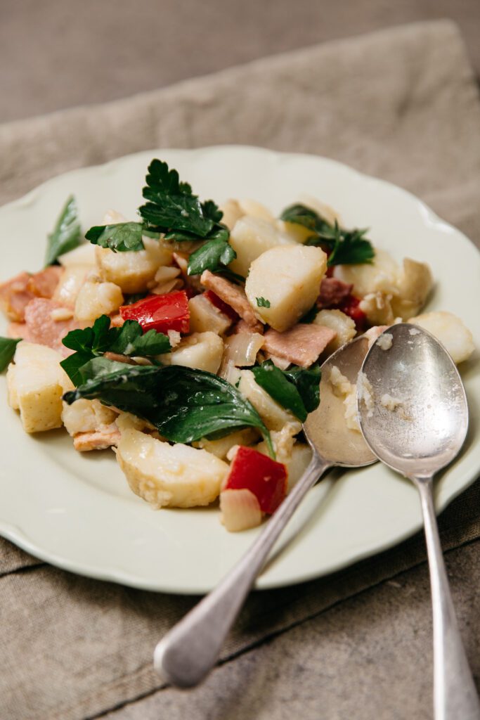 This potato salad is gutsy and full of flavor. The dressing contains bacon, capsicum, onion, garlic and oregano, all bathed in red wine vinegar and olive oil. By tossing the hot cooked potatoes into the warm dressing, they absorb all that incredible flavor. The salad keeps well too, the flavours improve the longer it sits….