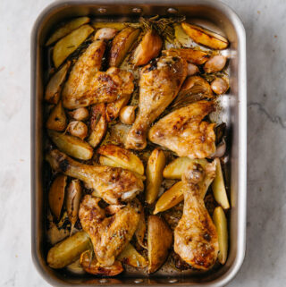 One Pan Roasted Chicken Pieces with Potatoes, Garlic, Lemon and Herbs